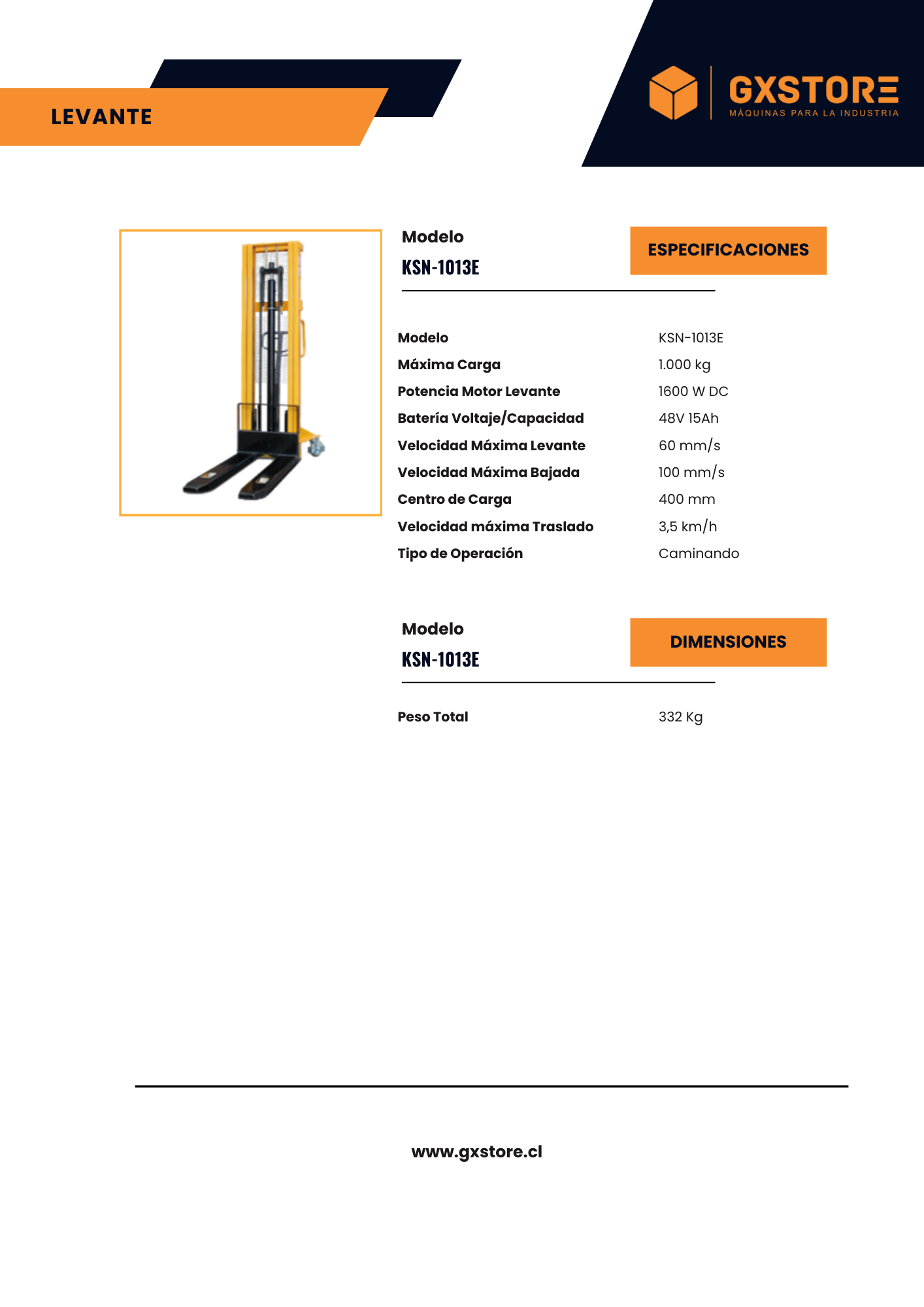 Robusto y seguro, con un peso total de 332 kg, el apilador Kösner KSN-1013E está diseñado para mejorar la eficiencia y facilidad en operaciones de carga y descarga, facilitando la logística diaria.