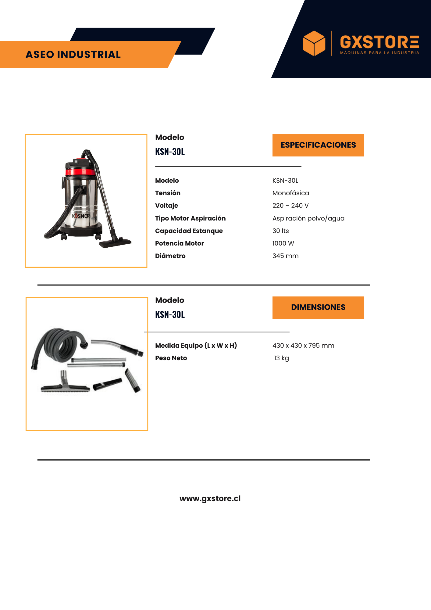 La Aspiradora Industrial Polvo/Agua Kosner KSN-30L de 30 litros, modelo KSN-30L, opera con una tensión monofásica de 220-240 V, con un potente motor de 1000 W diseñado tanto para la aspiración de polvo como de líquidos. Con un estanque de capacidad de 30 litros fabricado en acero inoxidable y un peso neto de 13 kg, esta máquina cuenta con dimensiones compactas de 430 x 430 x 795 mm y un diámetro de 345 mm, lo que la hace ideal para el transporte y uso en diversas áreas. Equipada con un kit de accesorios profesionales, esta aspiradora está construida con material plástico resistente a sustancias químicas y altas temperaturas, asegurando durabilidad y rendimiento óptimo. Su diseño permite la limpieza eficiente de alfombras, cortinas, sillones y rincones, siendo una herramienta versátil para oficinas, casas e industrias. Además, su filtro de poliéster es fácilmente lavable y reutilizable, garantizando un mantenimiento sencillo y prolongando su vida útil.