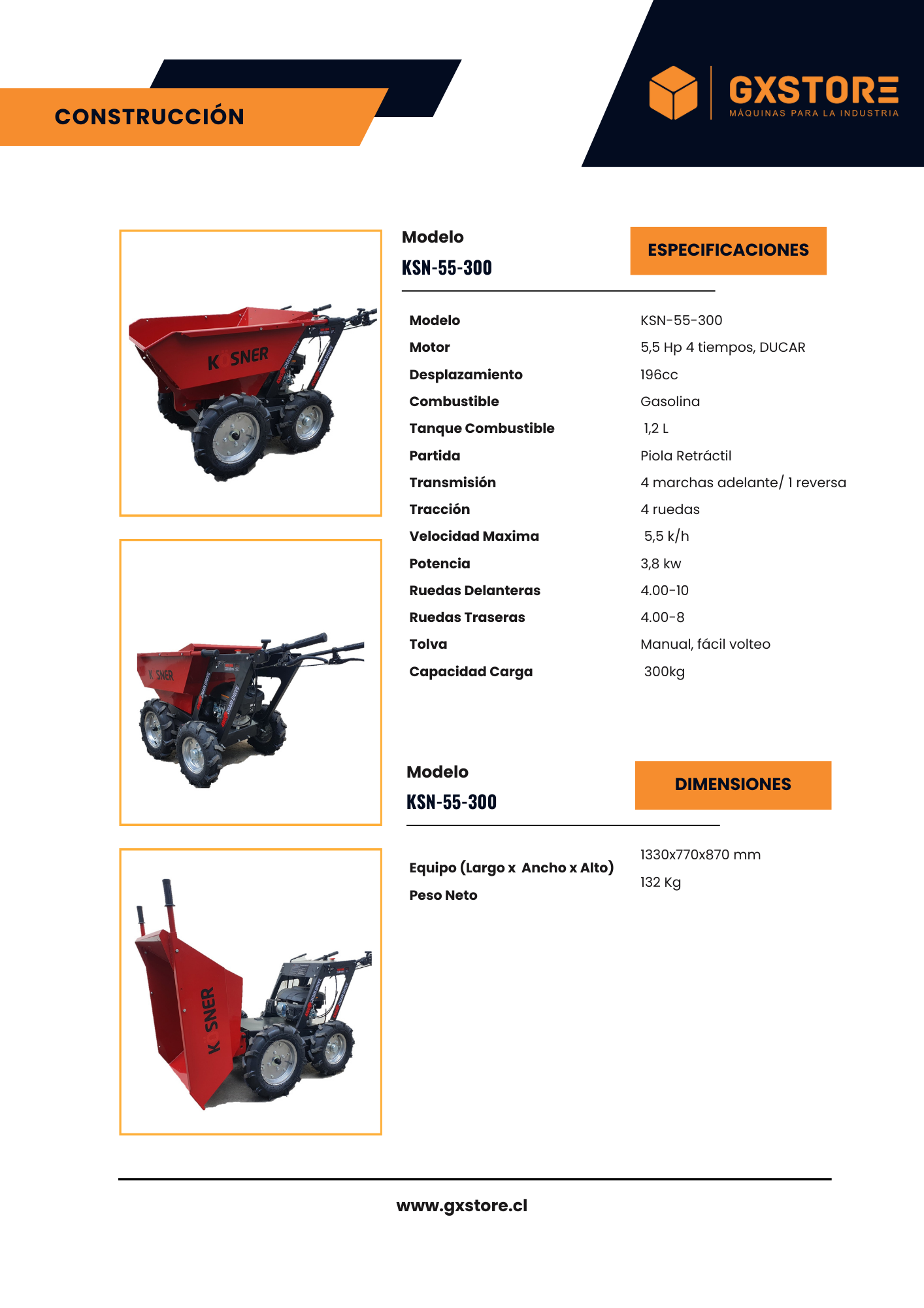 La Carretilla a Gasolina Kosner KSN-55-300, equipada con un motor de 5,5 Hp de 4 tiempos DUCAR, ofrece un rendimiento confiable para el transporte de una variedad de materiales pesados como cemento, arena, piedras y más. Con una capacidad de carga de 300 kg y una transmisión de 4 marchas adelante y 1 reversa, esta carretilla garantiza una operación eficiente y segura en entornos de construcción, agricultura y jardinería. Su diseño de tracción en las 4 ruedas y su tolva manual de fácil volteo proporcionan versatilidad y comodidad en el manejo de materiales, mientras que su estructura robusta y sus ruedas duraderas aseguran una larga vida útil incluso en condiciones exigentes. Con dimensiones de 1330x770x870 mm y un peso neto de 132 kg, esta carretilla es una opción ideal para quienes buscan calidad y rendimiento en sus proyectos.
