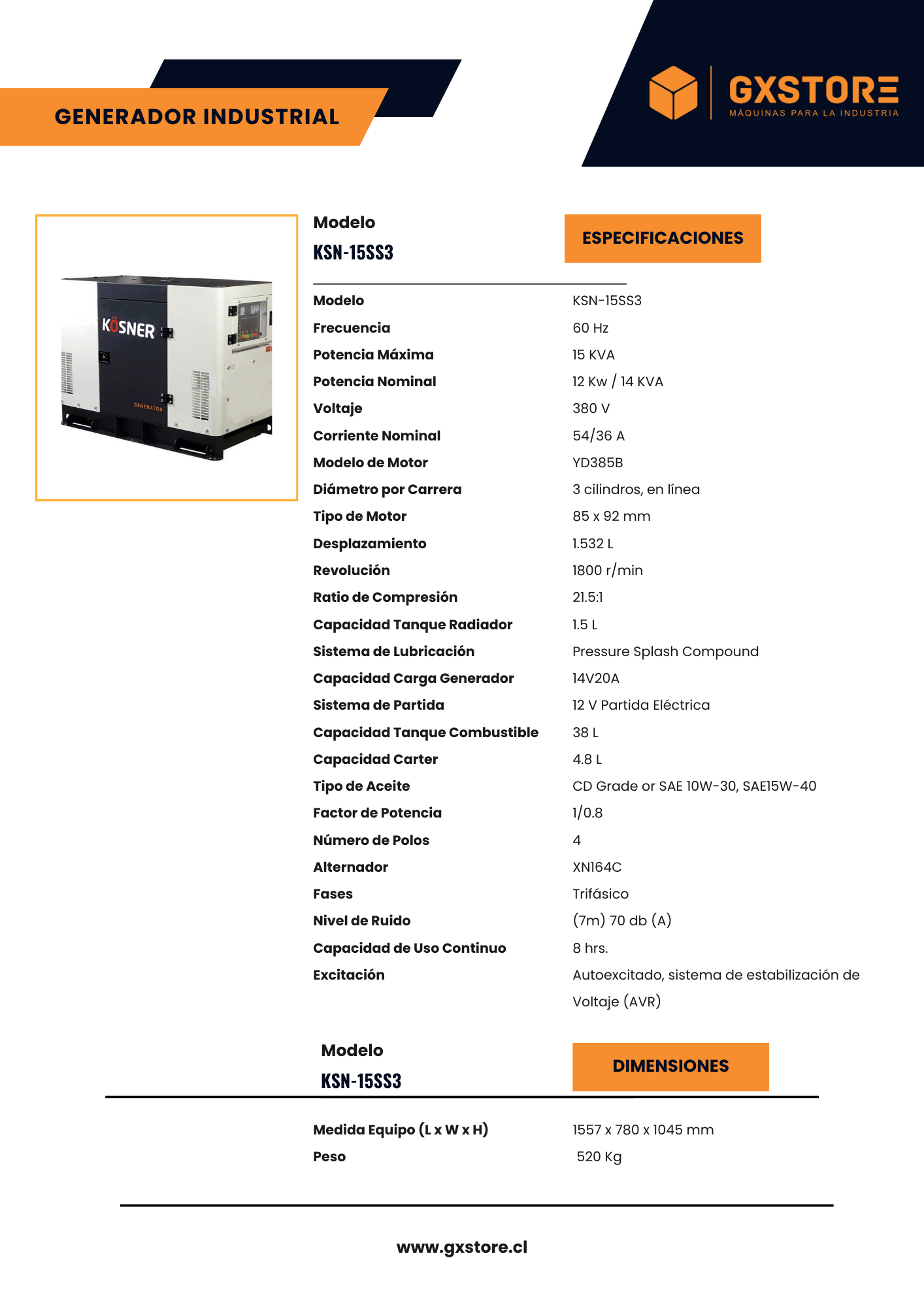 Las dimensiones del equipo son 1557 x 780 x 1045 mm y tiene un peso de 520 kg, lo que lo hace robusto y estable para diversas aplicaciones industriales. Este generador es ideal para entornos que requieren una fuente de energía confiable y eficiente, combinando durabilidad y un rendimiento superior en un diseño insonorizado.