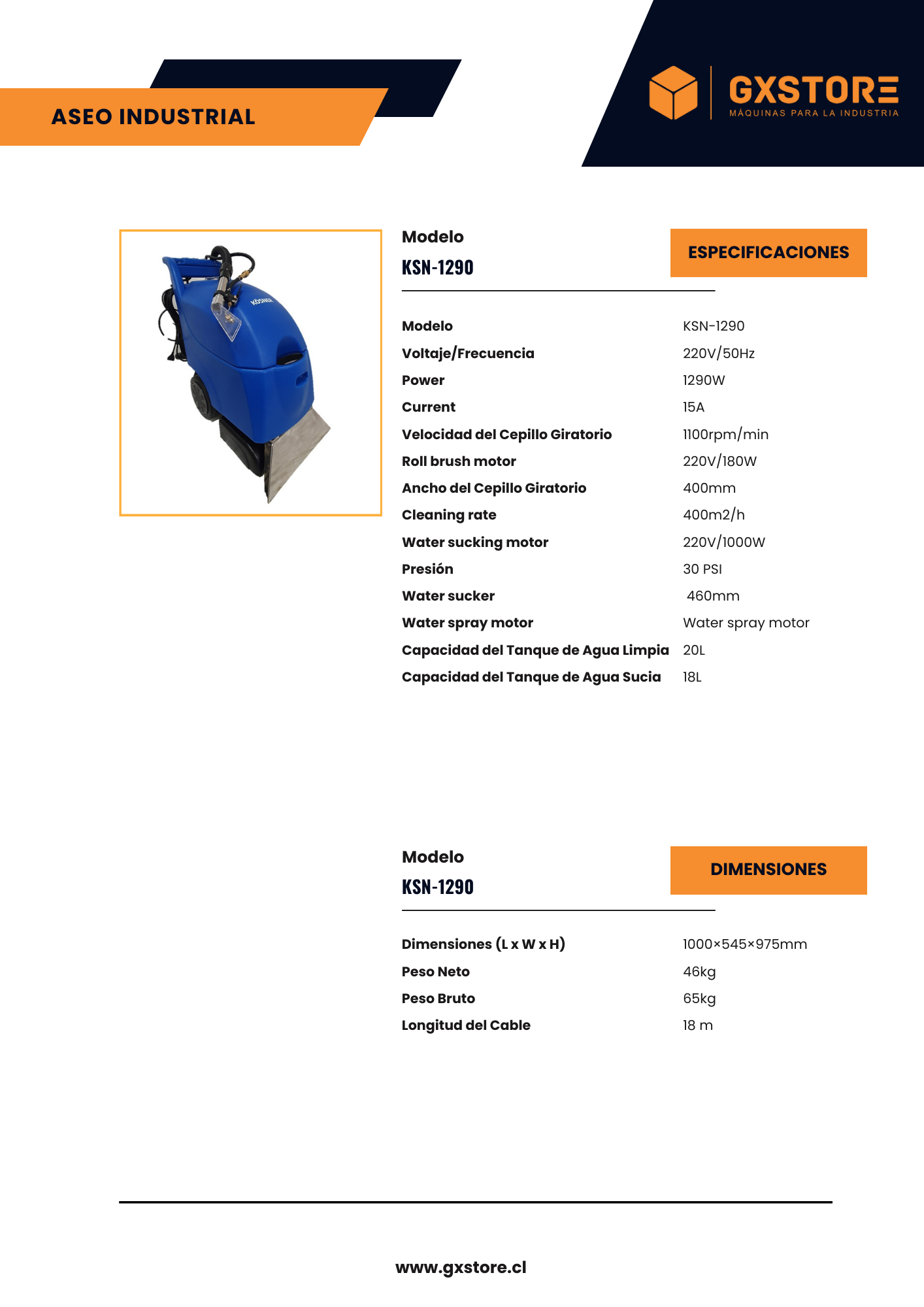 Introducimos la potente Lavadora de Alfombras y Tapices KSN-1290, diseñada para ofrecer un rendimiento excepcional en la limpieza profunda de superficies textiles. Con un voltaje de 220V y una potencia de 1290W, esta máquina ofrece una limpieza eficiente y efectiva en una variedad de entornos. Su cepillo giratorio con una velocidad de 1100rpm/min y un ancho de 400mm asegura una limpieza rápida y completa, con una tasa de limpieza de hasta 400m2/h. Equipada con un potente motor de succión de agua de 1000W, puede manejar grandes volúmenes de líquidos, con una capacidad de tanque de agua limpia de 20L y un tanque de agua sucia de 18L. Con un diseño robusto y dimensiones de 1000×545×975mm, esta lavadora garantiza durabilidad y eficiencia en cada uso, convirtiéndola en la elección perfecta para aplicaciones comerciales y residenciales.
