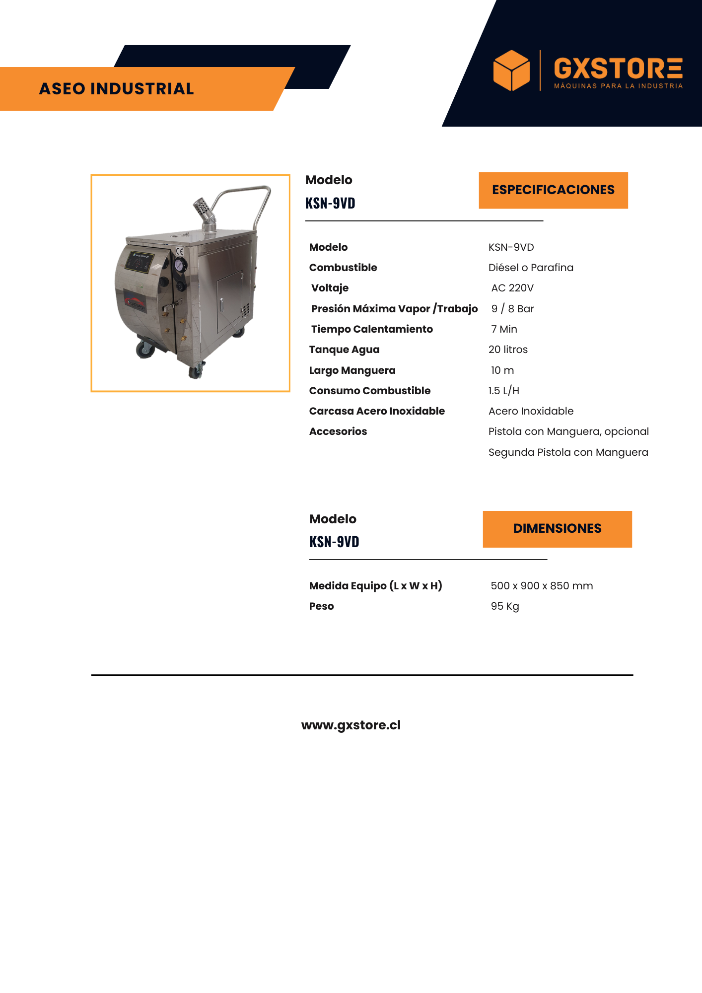 Con un consumo de combustible de 1.5 litros por hora, esta máquina a vapor es eficiente en su funcionamiento. Su carcasa de acero inoxidable garantiza durabilidad y resistencia a las condiciones industriales. Con dimensiones de 500 x 900 x 850 mm (Ancho x Largo x Alto) y un peso de 95 kg, es una máquina robusta pero fácil de transportar y manejar en el lugar de trabajo.